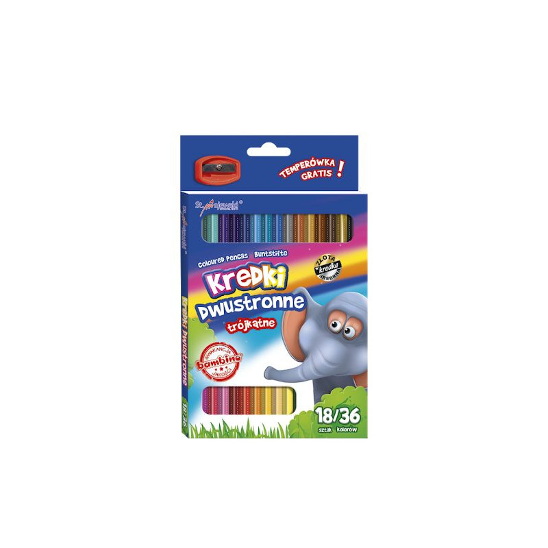 KREDKI OŁÓWKOWE TRÓJKĄTNE ST.MAJEWSKI 36 KOLORÓW DWUSTRONNE 18 SZTUK Z TEMPERÓWKĄ