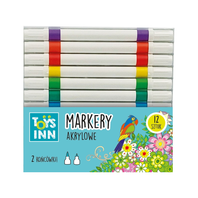 Zestaw 12 markerów akrylowych, wyposażonych w dwie końcówki o różnej grubości.