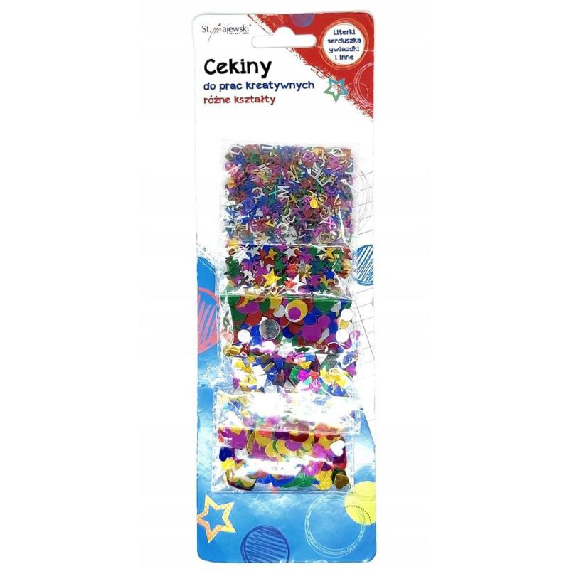 Zestaw zawiera pięć rodzajów cekinów. Są to literki, gwiazdki, kółka, kwadraty i trójkąty, oraz serduszka.