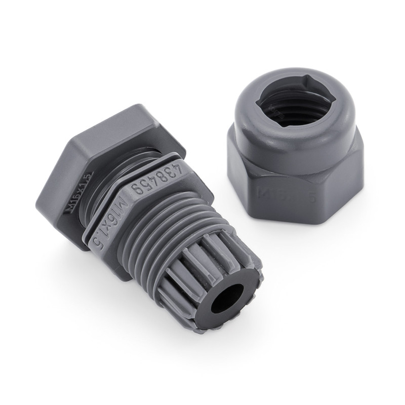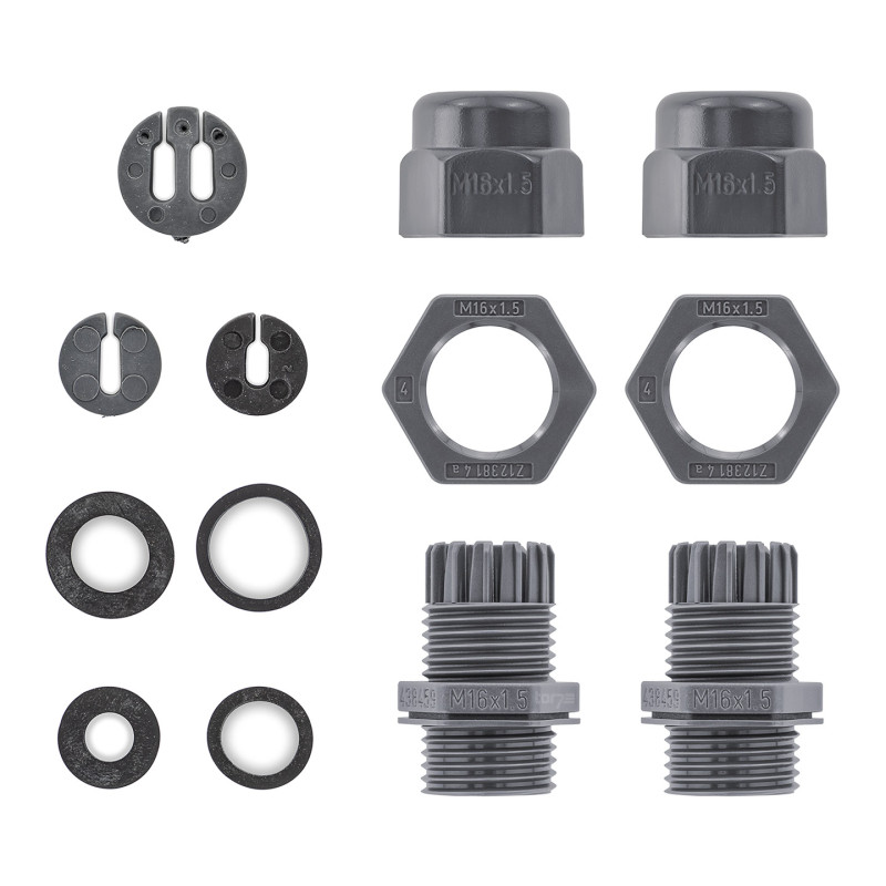 Dołączone uszczelki zapewniają wodoszczelne połączenie różnych typów przewodów zasilających o różnych przekrojach z podstawą pustej obudowy Hörmann IP 54, która jest często stosowana przez firmę Hörmann . Czarne śruby M16, zgodnie z tradycją producenta, są optymalnie dopasowane kolorystycznie i wzorniczo do obudowy, zapewniając stopień ochrony IP54. Dzięki temu odpowiednie produkty można stosować w pokrywie pustej obudowy Hörmann IP 54 również na zewnątrz.