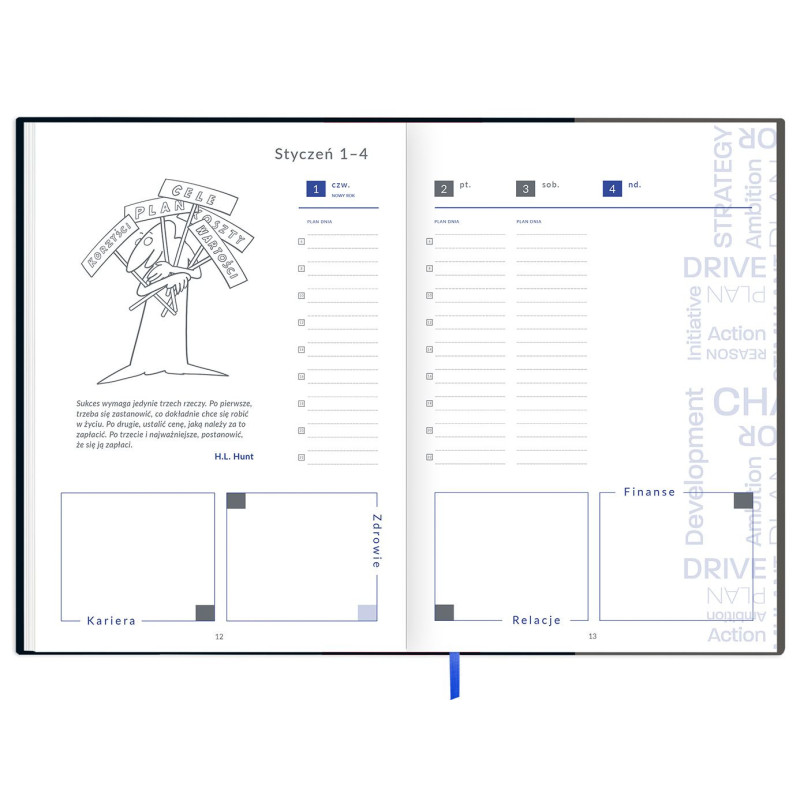 Kalendarz tygodniowy 2026 inspirowany filozofią Briana Tracy’ego to połączenie klasycznego planera z praktycznym przewodnikiem rozwoju osobistego. Oprócz standardowego układu tygodniowego, zawiera ćwiczenia, refleksje i narzędzia, które wspierają w organizacji czasu, budowaniu nawyków i osiąganiu celów.