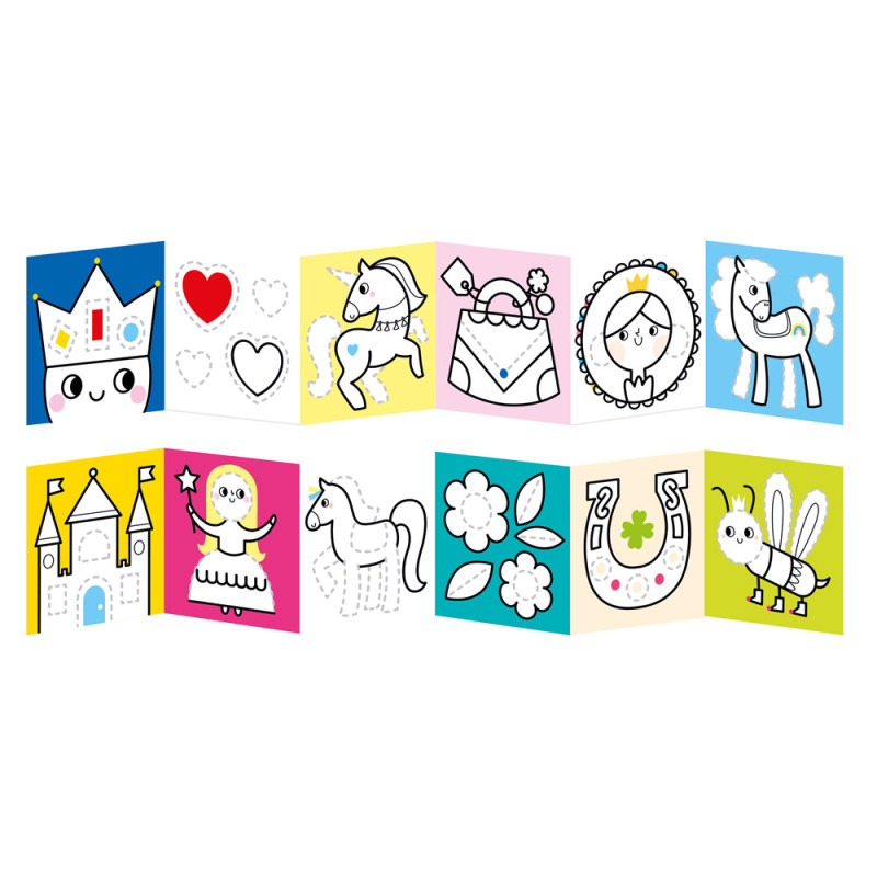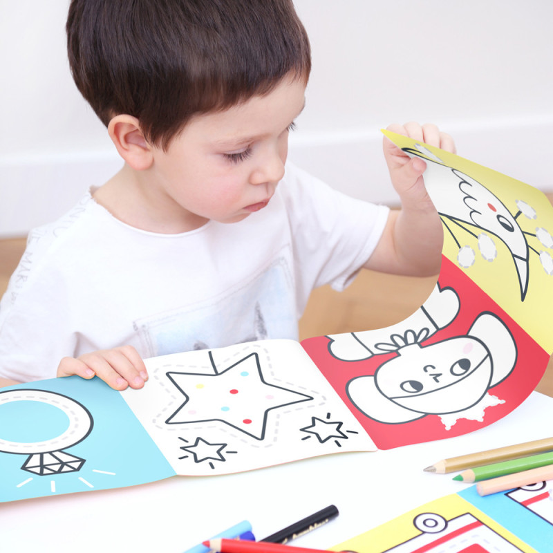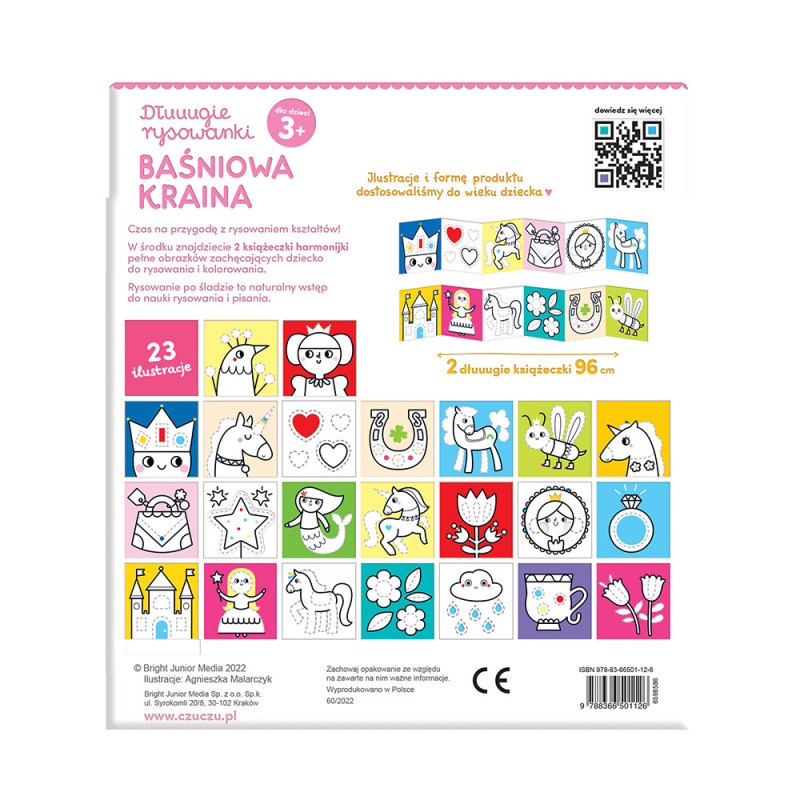 Rysowanie po śladzie to naturalny wstęp do nauki rysowania i pisania.W środku znajdziecie 2 książeczki harmonijki pełne obrazków zachęcających dziecko do rysowania i kolorowania.