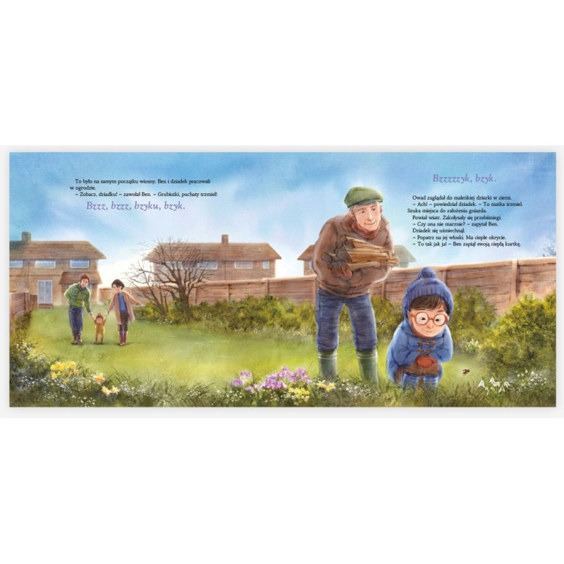 Wczesną wiosną Ben spędza z dziadkiem czas w ogrodzie. W pewnej chwili chłopiec zauważa grubiutkiego, puchatego owada. To królowa trzmieli, która właśnie obudziła się ze snu zimowego i szuka miejsca na gniazdo. Tak zaczyna się dla Bena fascynująca lekcja przyrody. Dziadek stopniowo – w rytmie pór roku – objaśnia wnukowi cykl życia trzmieli i innych zapylaczy, a chłopiec odkrywa, jak wiele wspólnego mamy z naszymi bzyczącymi przyjaciółmi. Gdy latem dowiaduje się, że słodkie i soczyste truskawki zawdzięcza pszczołom, koniecznie chce im się odwdzięczyć. Na szczęście dziadek wie, jak można to zrobić.