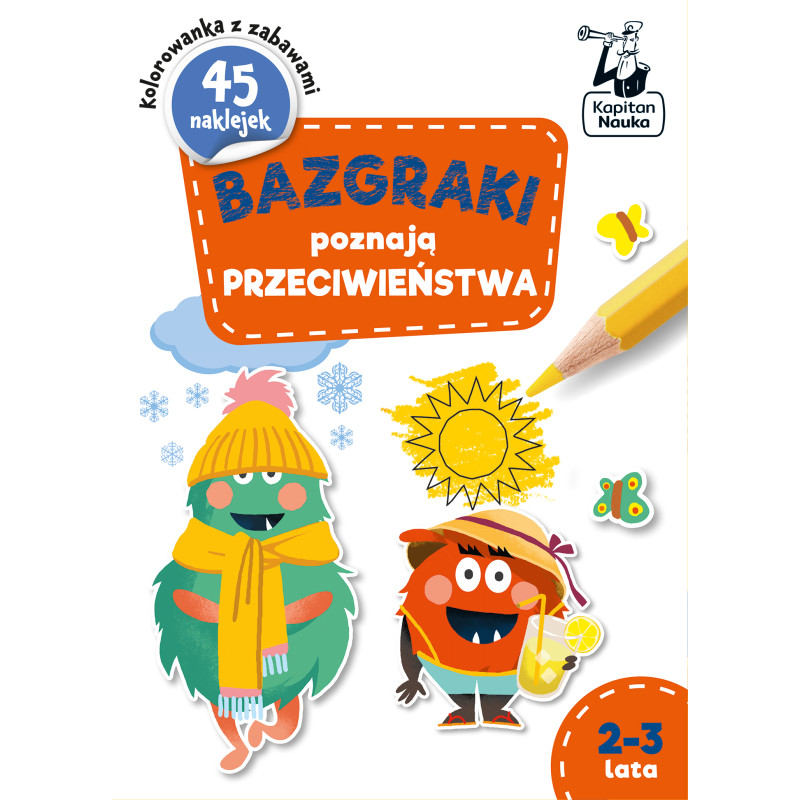 Bazgraki poznają PRZECIWIEŃSTWA(2–3 lata) to książeczka z pomysłowymi zadaniami dla maluchów, która rozwija wiedzę o świecie, spostrzegawczość i myślenie logiczne. W zabawach z książeczką maluch poznaje takie przeciwieństwa jak: mały – duży, szybki – wolny, zimny – ciepły czy długi – krótki. Uczy się rozpoznawać różnice i podobieństwa oraz łączyć obiekty w pary na zasadzie skojarzeń. Przy okazji rozwija słownictwo związane z cechami ludzi, zwierząt i przedmiotów.