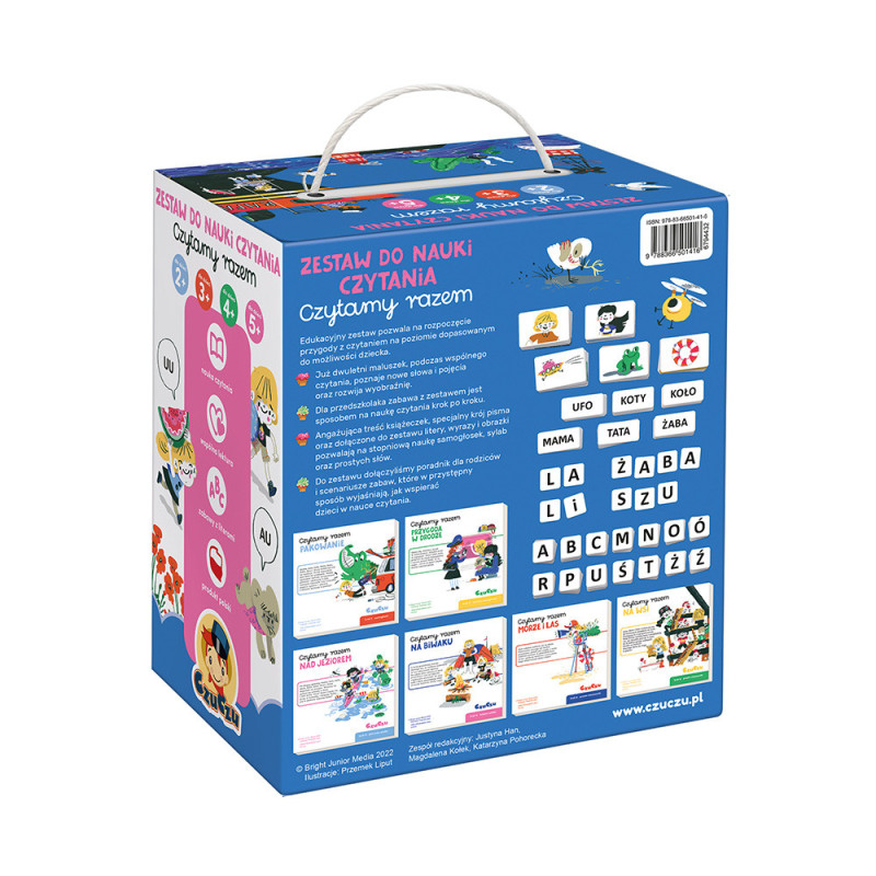 W środku kolorowego opakowania z uchwytem znajdziesz sześć książeczek harmonijek, dwa poradniki, które pomogą Ci w prowadzeniu kreatywnych ćwiczeń oraz zainspirują do wymyślenia swoich własnych sposobów na naukę, w oparciu o indywidualne potrzeby dziecka, a także scenariusze zabaw, aby czytanie nie kojarzyło się z czymś nieprzyjemnym. Taka forma nauki, pełna uśmiechu i radości, rozwinie wyobraźnię i zachęci dziecko do samodzielnego czytania.