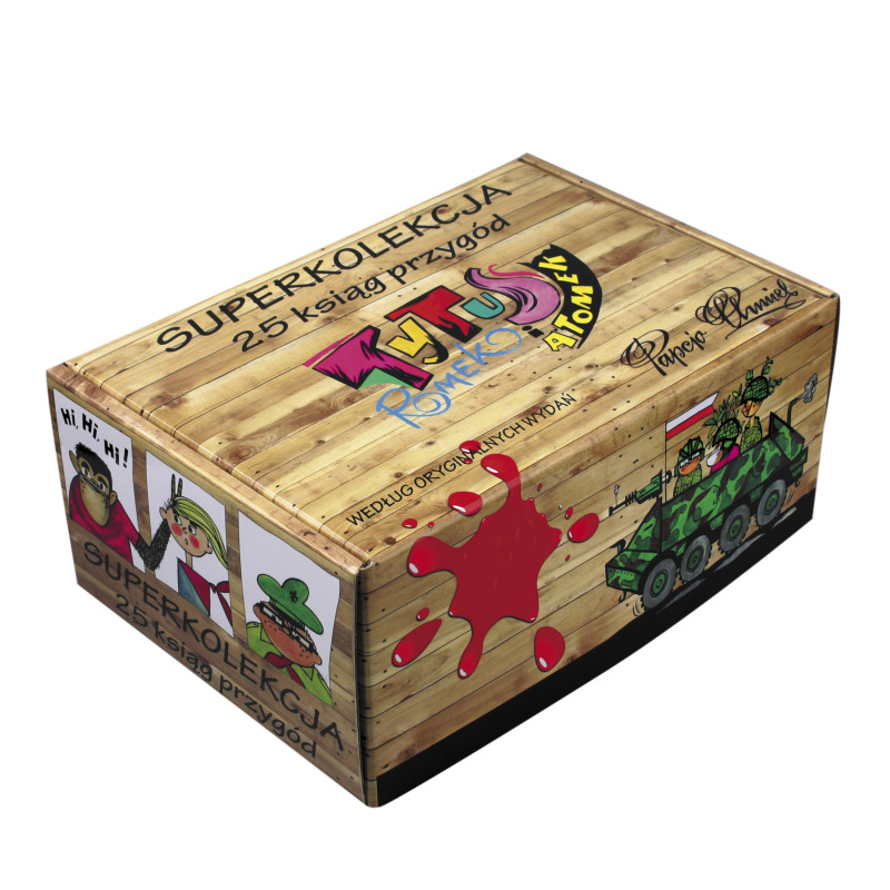 Komplet 25 oryginalnych wydań komiksów z Tytusem, Romkiem i A’Tomkiem, autorstwa Henryka Jerzego Chmielewskiego, zwanego Papciem Chmielem, zebranych razem w kolekcjonerskim pudełku.