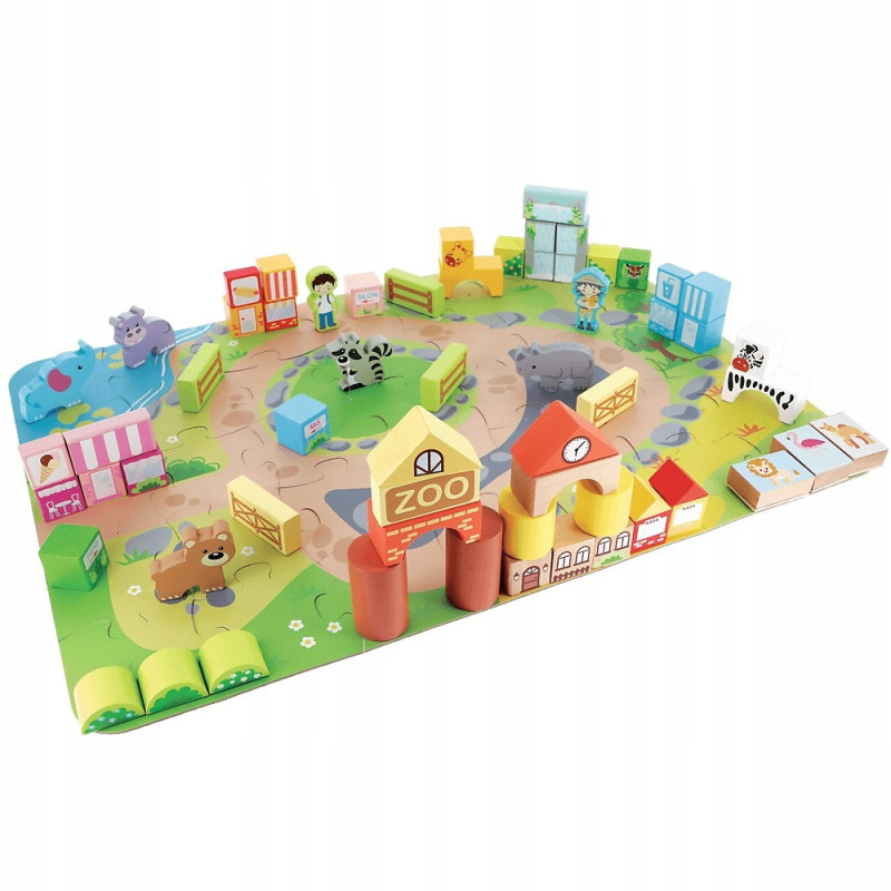 Edukacyjny zestaw 66 kolorowych klocków tematycznych z matą puzzlową, stworzony we współpracy z psychologiem, z myślą o potrzebach najmłodszych. Zbuduj zoo: kasy, sklepiki, wodospad, zagrodę dla zwierząt.
