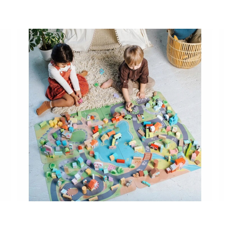 Połącz zestaw z innymi zestawami z serii O!Klocki: MIASTO, FARMA i WESOŁE MIASTECZKO! Maty stworzą spójną grafikę. Stwórz świat według własnej koncepcji.