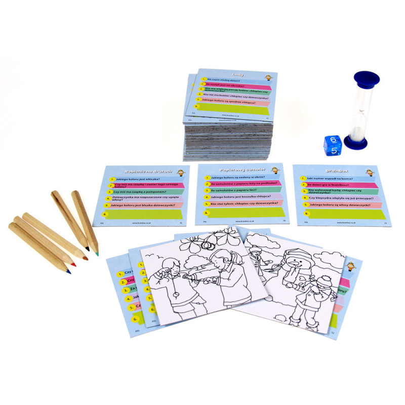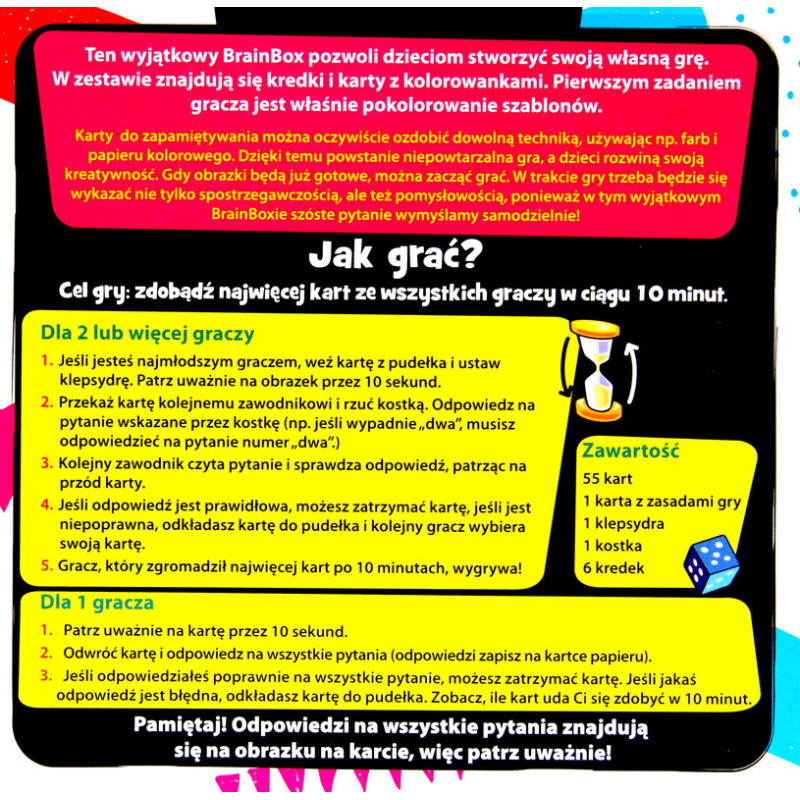 Patrz uważnie na kartę przez 10 sekund. Zapamiętaj kolory, kształty i inne szczegóły przedstawione na obrazkach. Za pomocą kostki wylosuj pytanie i udziel poprawnej odpowiedzi. Graj przez 10 minut. Twoim celem jest zdobycie jak największej ilości kart.