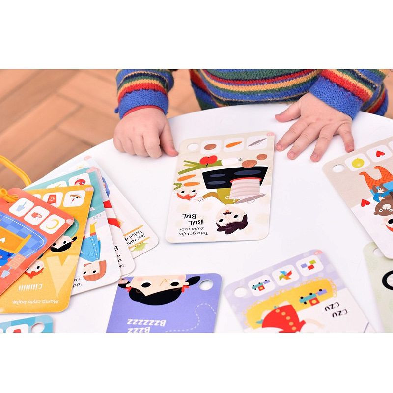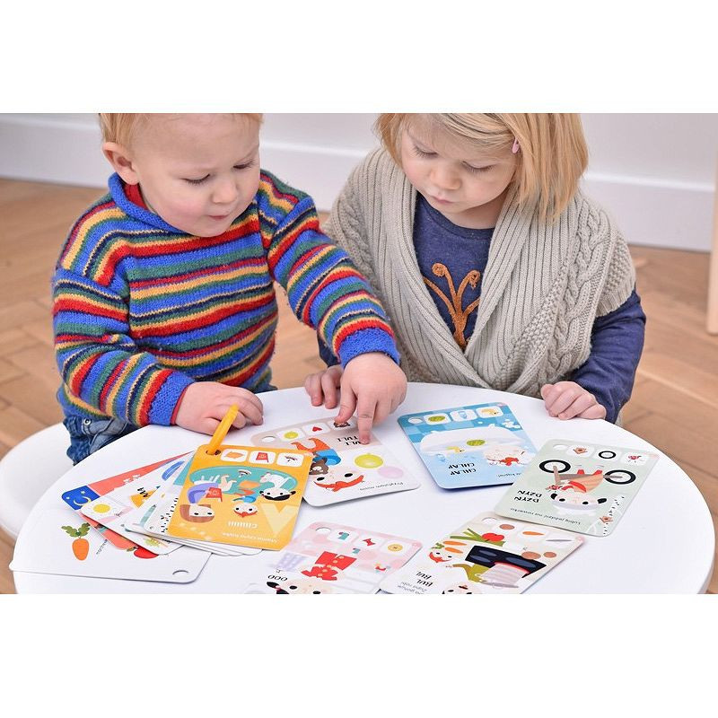 Innowacyjna kartonowa książeczka w pomysłowy sposób zachęci najmłodszych do zwracania uwagi na to, co widać i słychać wokół nich. Na 24 stronach pokazano przedmioty i sytuacje znane maluchom z codzienności. Dodatkowa zabawa polega na wyszukiwaniu elementów z ramki na ilustracji. Praktyczne kółeczko pozwala na korzystanie z pojedynczych kart i zawieszenie jej np. przy wózku. Do zestawu dołączono poradnik dla rodziców, pełen pomysłów na wspólną zabawę.