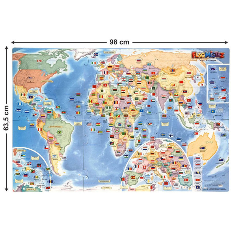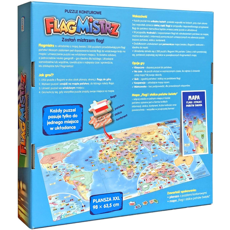 Flagmistrz to układanka z mapą świata i 200 puzzlami przedstawiającymi flagi państw!