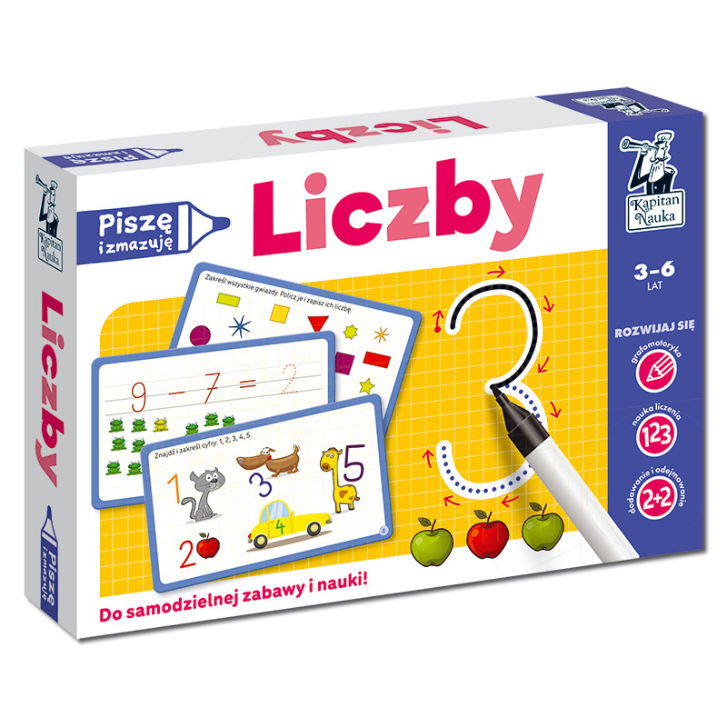 Piszę i zmazuję. Liczby (3–6 lat) to bogato ilustrowany zestaw zabaw (książka + karty ścieralne + flamaster) do nauki cyfr i liczb, który rozwija umiejętność liczenia oraz wspiera rozwój grafomotoryczny. Dzięki kolorowym łamigłówkom i zadaniom graficznym przedszkolaki uczą się poprawnego kierunku pisania liczb oraz doskonalą umiejętność przeliczania przedmiotów i rozwiązywania prostych działań arytmetycznych. Rozwijają przy tym również zdolność do koncentracji i myślenia logicznego.