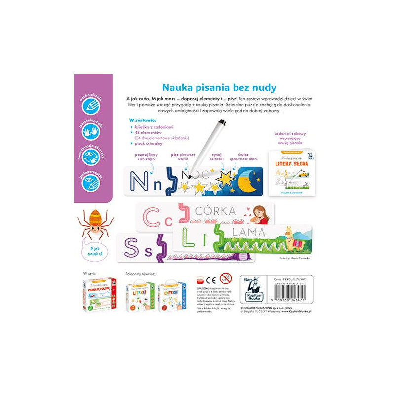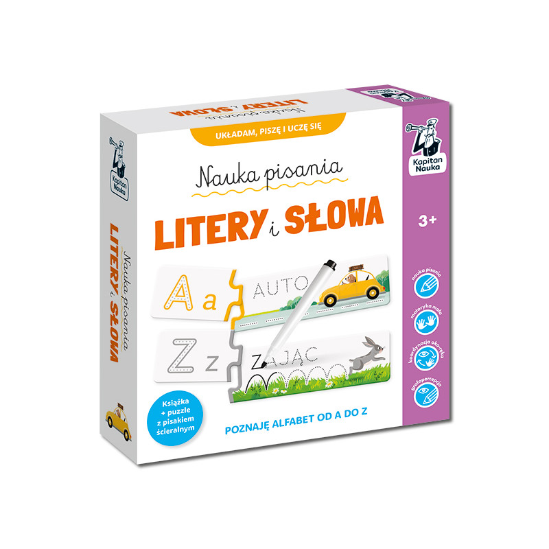 Zestaw pozwala poznać 24 podstawowe litery alfabetu. Książka z różnorodnymi zadaniami zachęca do pierwszych prób pisania, a dołączone do zestawu puzzle pozwalają utrwalić nowo zdobyte umiejętności. W czasie zabawy dziecko łączy elementy z literami i odpowiadającymi im słowami oraz rozwija sprawność grafomotoryczną, poprawiając pisakiem szlaczki, litery i słowa. Ścieralna powierzchnia puzzli umożliwia wielokrotne próby i doskonalenie pisania. Barwne ilustracje z wesołymi postaciami ułatwiają zapamiętywanie liter.
