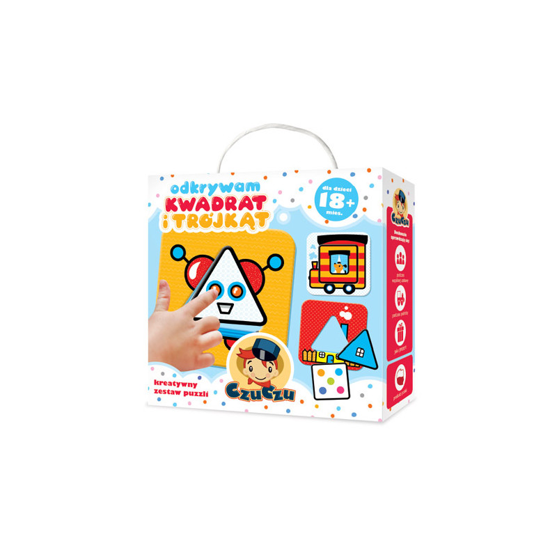 Odkrywam Kwadrat i Trójkąt to komplet ośmiu wytrzymałych, dwustronnych puzzli.
