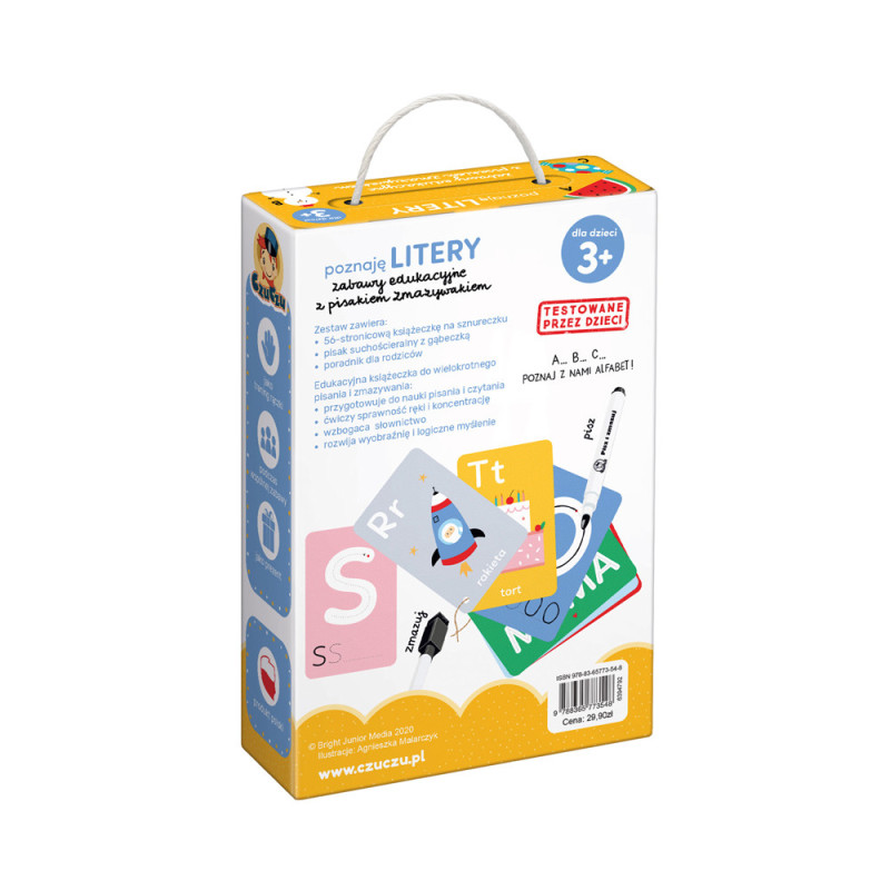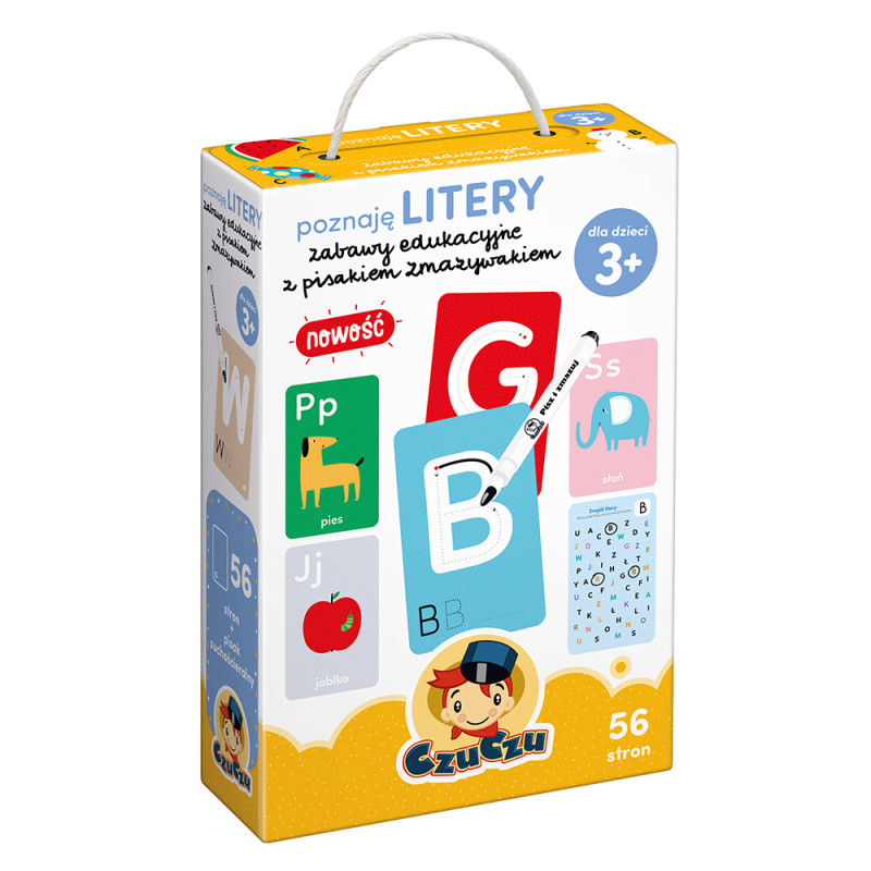 56-stronicowa książeczka pełna zabawnych ilustracji to zaproszenie do świata liter. Zachęci maluchy do rysowania oraz podejmowania prób pisania i czytania. Ciekawe i zróżnicowane zadania oraz możliwość wielokrotnego pisania i zmazywania sprawiają, że edukacyjna zabawa może trwać bez końca. Do zestawu dołączono pisak suchościeralny i poradnik dla rodziców pełen pomysłów na korzystanie z książeczki.
