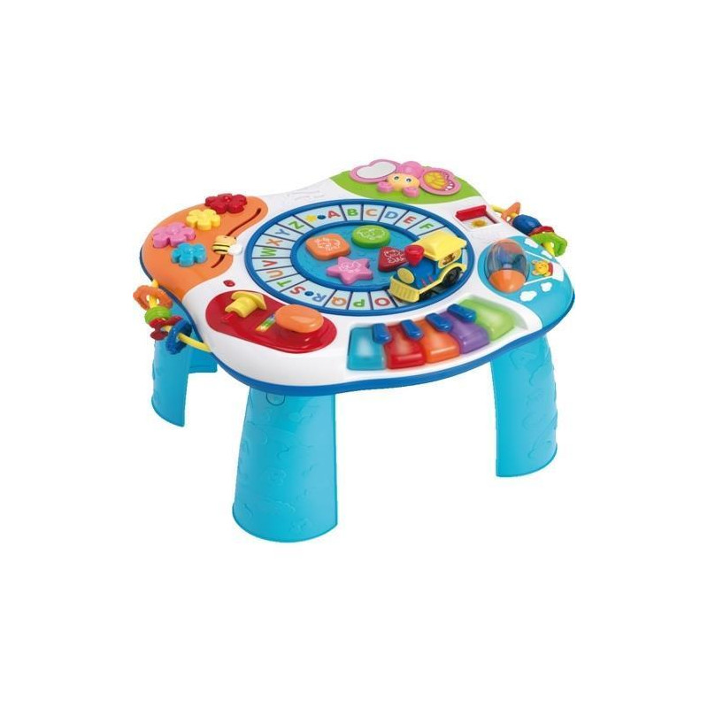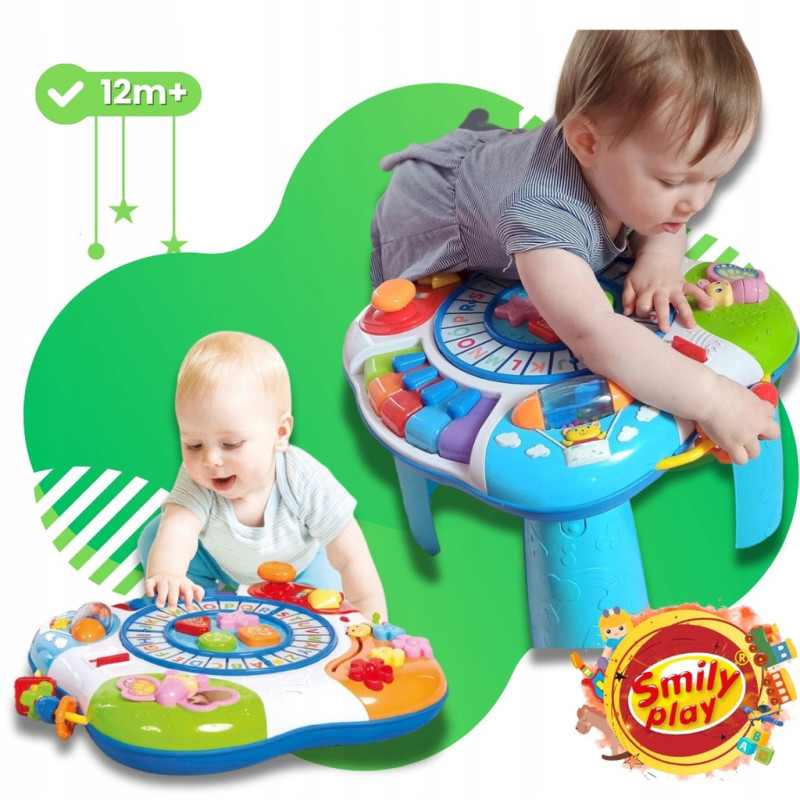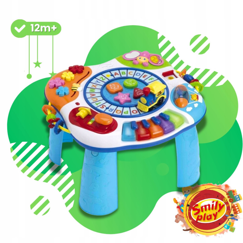 Na kolorowym blacie stolika Smily Play znajdziesz tory z literkami, po których jeździ wydająca dźwięki lokomotywa, grające pianinko, przesuwane okienko, dzięki któremu można zmienić porę dnia, barwne przyciski w różnych kształtach, które wydają dźwięki – jedne grają melodie, po naciśnięciu innych usłyszysz odgłosy zwierzątek. Stolik posiada także obrotowe grzechotki o różnych fakturach i kształtach, obracający się walec, we wnętrzu którego znajdują się kolorowe, grzechoczące kulki, a nawet dźwignię zmiany biegów, obok której znajduje się żółty gwizdek. Stoliczek edukacyjny został wyposażony także w bzyczącą pszczółkę, którą można przesuwać po falistej linii, a także mówiącego motylka z lusterkiem i ruchomym skrzydełkiem. Wbudowane w zabawkę światełka przyciągną wzrok brzdąca.