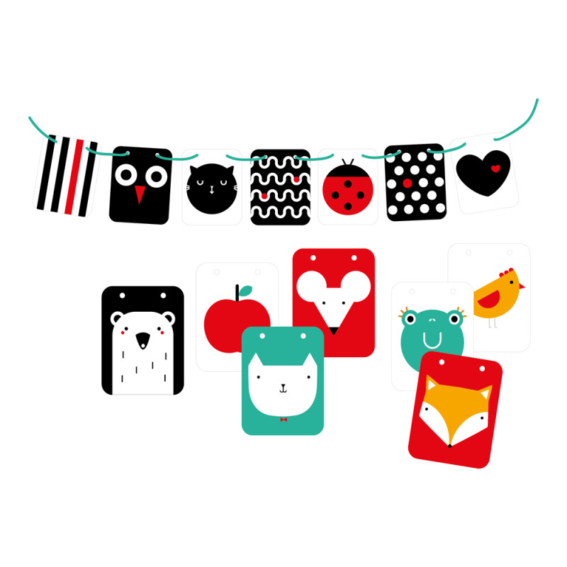 Książeczki harmonijkowe mają po rozłożeniu długość 98 cm. Można je ustawić wzdłuż łóżeczka lub kołyski albo na macie edukacyjnej czy po prostu na podłodze, na której leży niemowlę. Będzie mogło ono wygodnie oglądać zamieszczone na nich ilustracje. Obrazki dla noworodków są czarno-białe. Nieco starszym maluszkom możemy pokazywać bardziej skomplikowane, kolorowe ilustracje z książeczki lub kart. Z kart możemy zrobić efektowną girlandę, która znakomicie sprawdzi się również jako element dekoracyjny.
