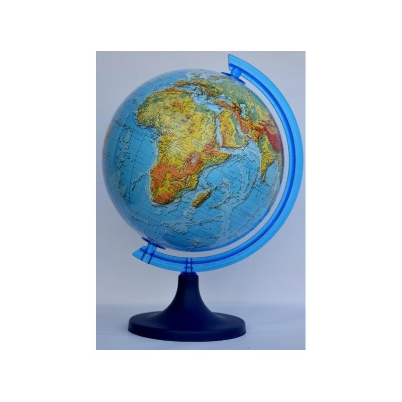 Praktyczny i estetyczny globus fizyczny o średnicy 25 cm, wyposażony w szczegółową mapę fizyczną świata z dodatkowym efektem trójwymiarowym, który zwiększa czytelność ukształtowania terenu. Globus ustawiono na stabilnej, niebieskiej plastikowej podstawie, dzięki czemu jest lekki i łatwy do przenoszenia.