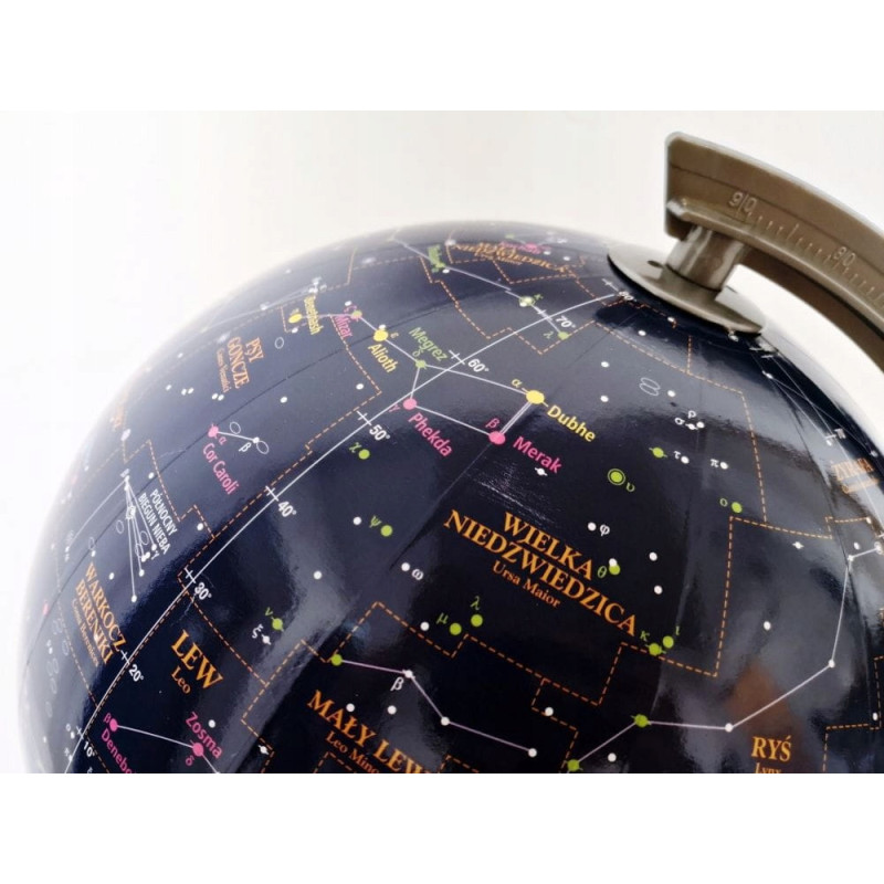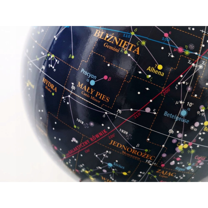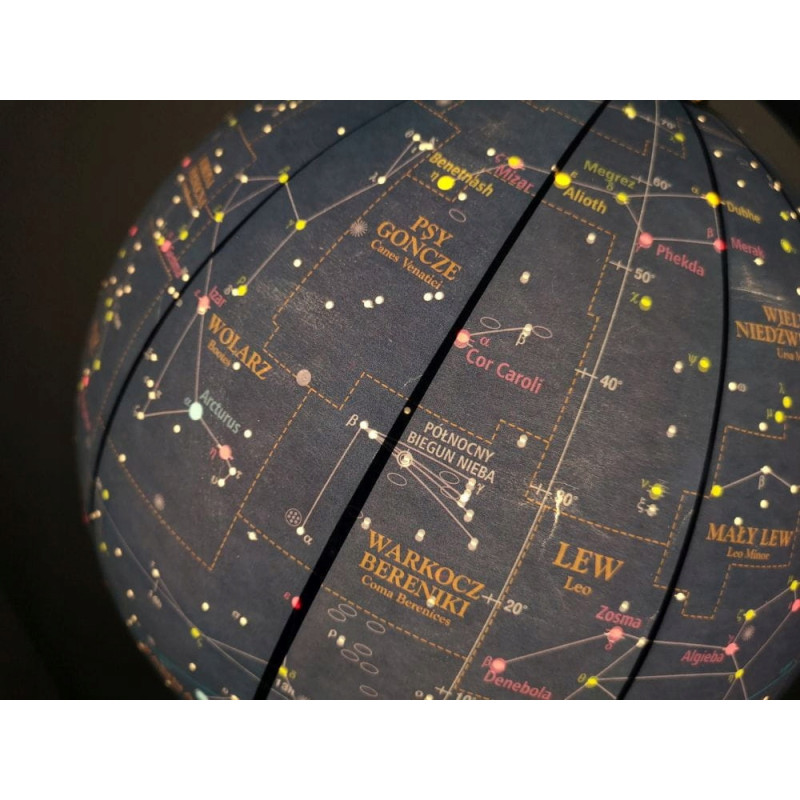 Podświetlany globus astralny 25 cm marki Zachem — mapa nieba z gwiazdozbiorami, typami gwiazd, znakami zodiaku i innymi obiektami astronomicznymi.