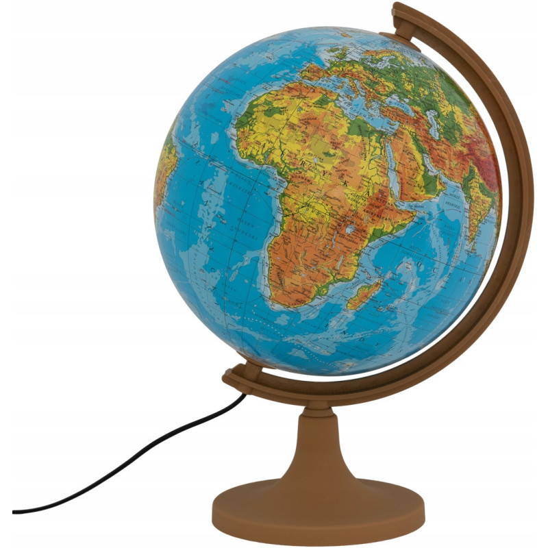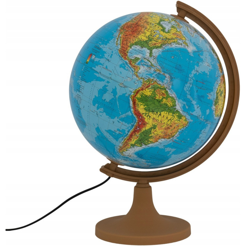 Czytelna mapa fizyczna świata przedstawia pełne ukształtowanie powierzchni Ziemi — pasma górskie, niziny, wyżyny, baseny oceaniczne oraz inne formy terenu. Po włączeniu oświetlenia globus zyskuje dodatkową głębię kolorów oraz nastrojowy charakter.