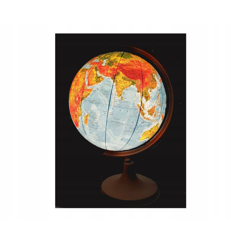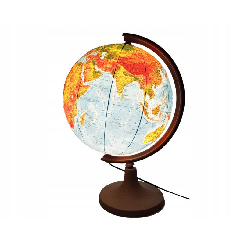 Globus 320 Polityczny–Fizyczny Podświetlany to nowoczesny i niezwykle praktyczny model edukacyjny, który łączy dwie mapy w jednym produkcie. W trybie standardowym prezentuje mapę polityczną świata, pokazując granice państw, stolice i najważniejsze miasta. Po włączeniu podświetlenia ukazuje się mapa fizyczna, dzięki której można poznać ukształtowanie powierzchni Ziemi.