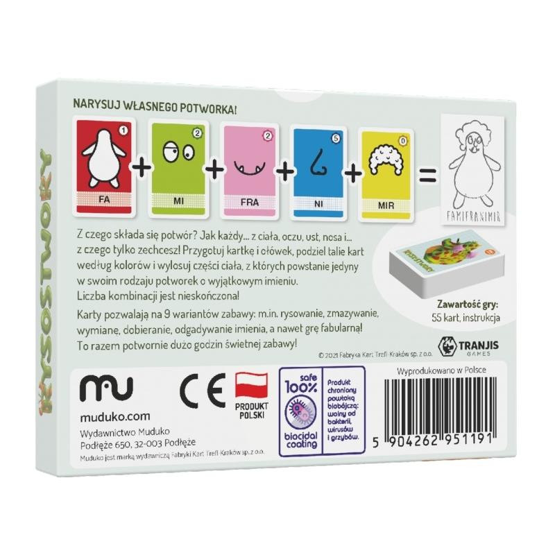 Weź kartkę, ołówek, dobieraj karty, narysuj swojego własnego potworka i nazwij go. Czy dasz radę wymówić jego imię? A może dla odmiany pobawimy się w… zmazywanie potworka? Dobieranie? Albo pomożemy potworkom, które pogubiły swoje części ciała, pozbierać się do kupy? Wariantów zabawy jest aż 9!