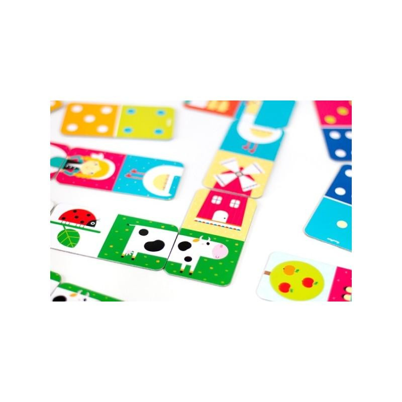 Zestaw zawiera 28 dwustronnych kafelków: z połówkami obrazków z jednej i tradycyjnymi kropkami z drugiej strony. Poziom trudności rozgrywki można dostosować do wieku i umiejętności graczy.