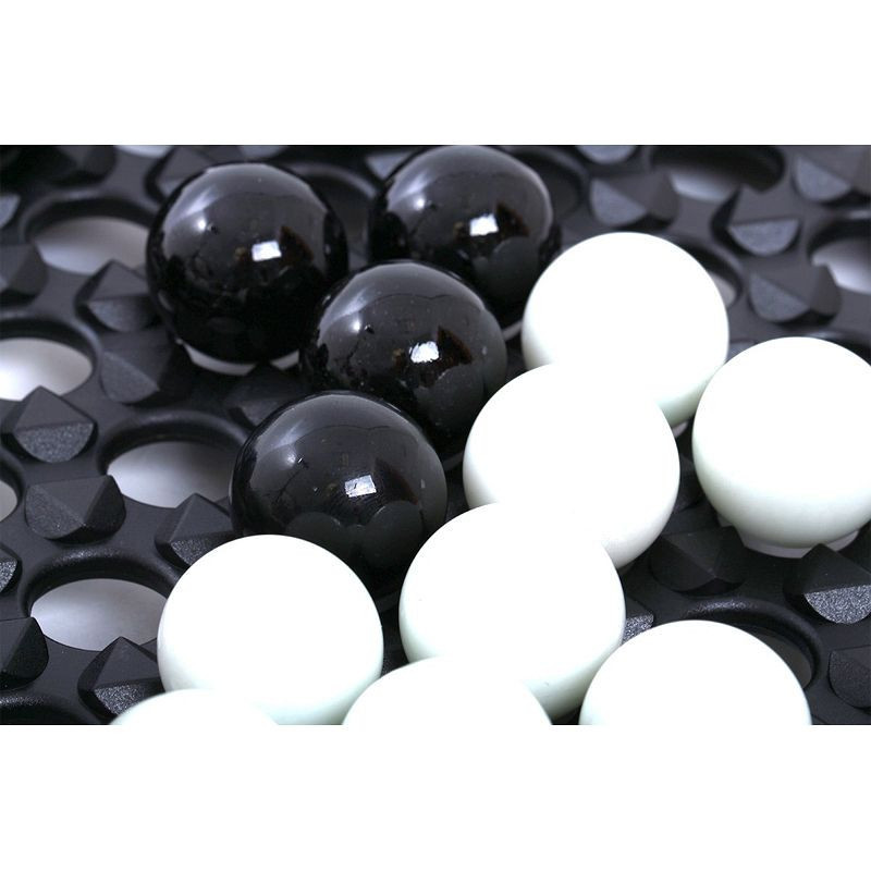 Dwóch graczy zasiada do sześciokątnej planszy z wgłębieniami, w której umieszcza się po 14 białych i czarnych kul.