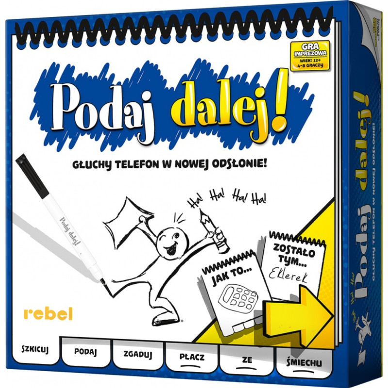 Wielokrotnie nagradzana gra Podaj dalej! zapewni Twojej rodzinie i przyjaciołom świetną rozrywkę i niezapomniane chwile niepowstrzymanego śmiechu. Narysuj to co widzisz i odgadnij to co widziałeś, a następnie podziwiaj nieprzewidywalny efekt ciągu skojarzeń wszystkich uczestników zabawy.