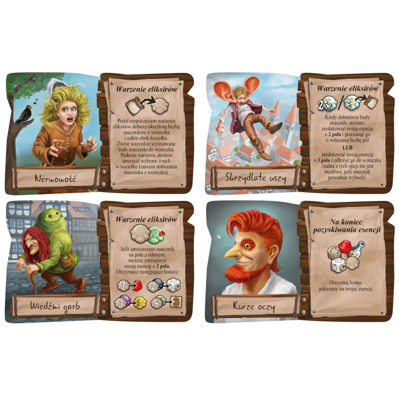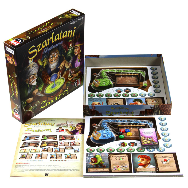 ZAWARTOŚĆ: 8 kart pacjentów 8 znaczników pacjentów 5 fiolek znachora 30 znaczników kwiatu paproci 40 białych znaczników składników 2 dwustronne księgi składników 20 kart esencji 20 kart wróżki 5 znaczników esencji instrukcja