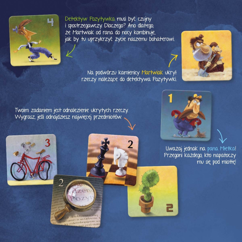 Gra z bohaterami książek Grzegorza Kasdepke!Pomóż detektywowi Pozytywce odnaleźć ukryte przedmioty. Wykaż się dobrą pamięcią i umiejętnością podejmowania ryzyka. I unikaj pana Mietka – przegoni każdego, kto napatoczy mu się pod miotłę!