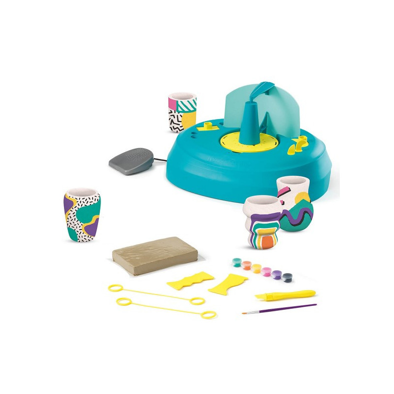 Zestaw zawiera: 1 koło garncarskie napędzane pedałem, 1 ekran przeciwrozpryskowy, pojemnik na wodę, 2 szablony do nadawania kształtów (4 kształty), blat obrotowy, 6 pojemników z farbą, 1 pędzelek, 1 kg gliny, drut odcinający, 1 zasilacz, narzędzia, 1 instrukcja obsługi.