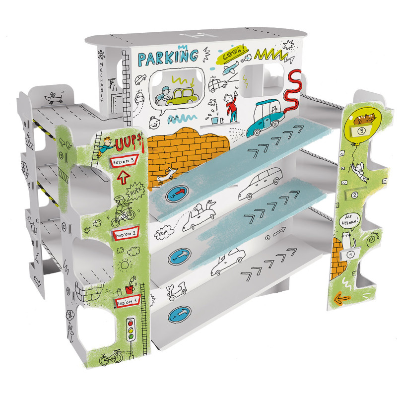 Twoje samochodziki nie mieszczą się na półce w pokoju? Potrzebują dużego parkingu, najlepiej takiego, który stworzysz sam! Przygotowaliśmy dla Ciebie gotowy projekt. Pokoloruj szablon kredkami, flamastrami lub farbami. Złóż go według instrukcji, bez użycia kleju i nożyczek. Możesz także poprosić o pomoc rodziców. I gotowe! Właśnie samodzielnie stworzyłeś parking dla swoich samochodzików!