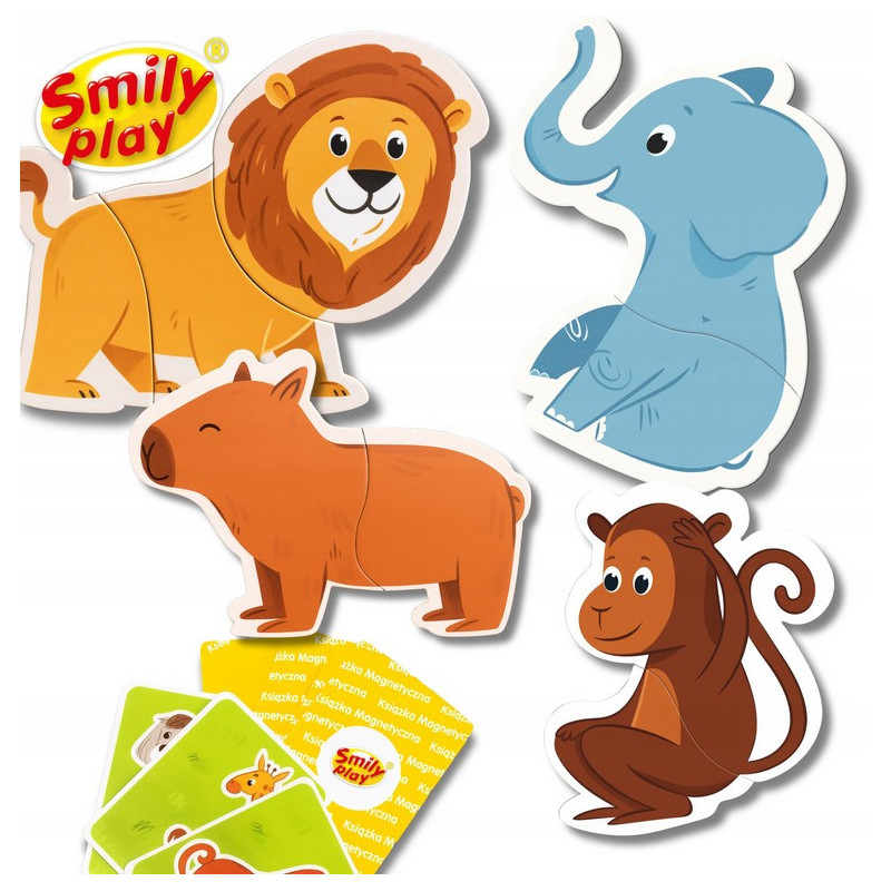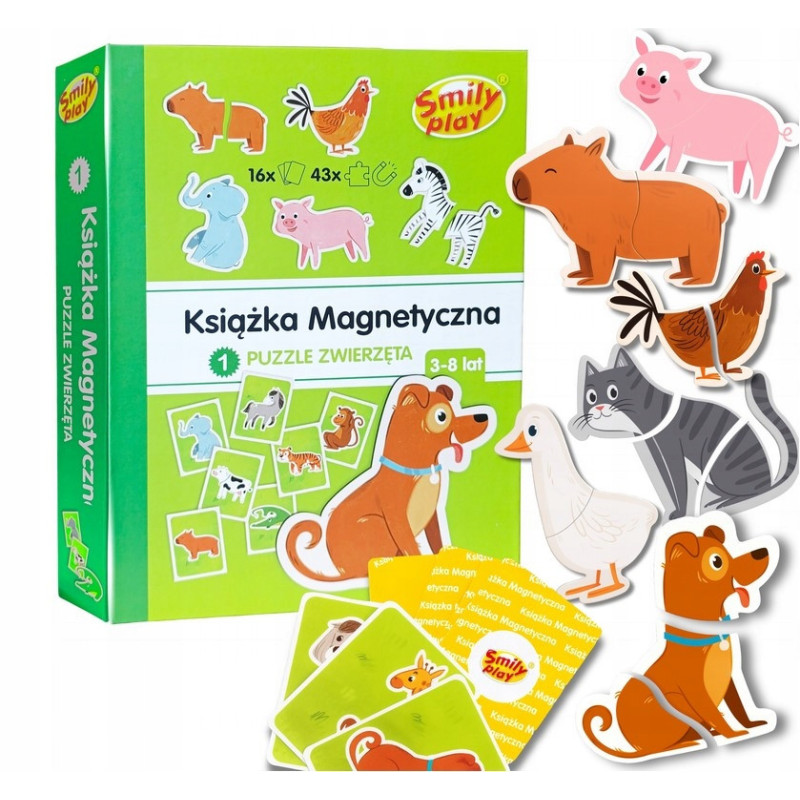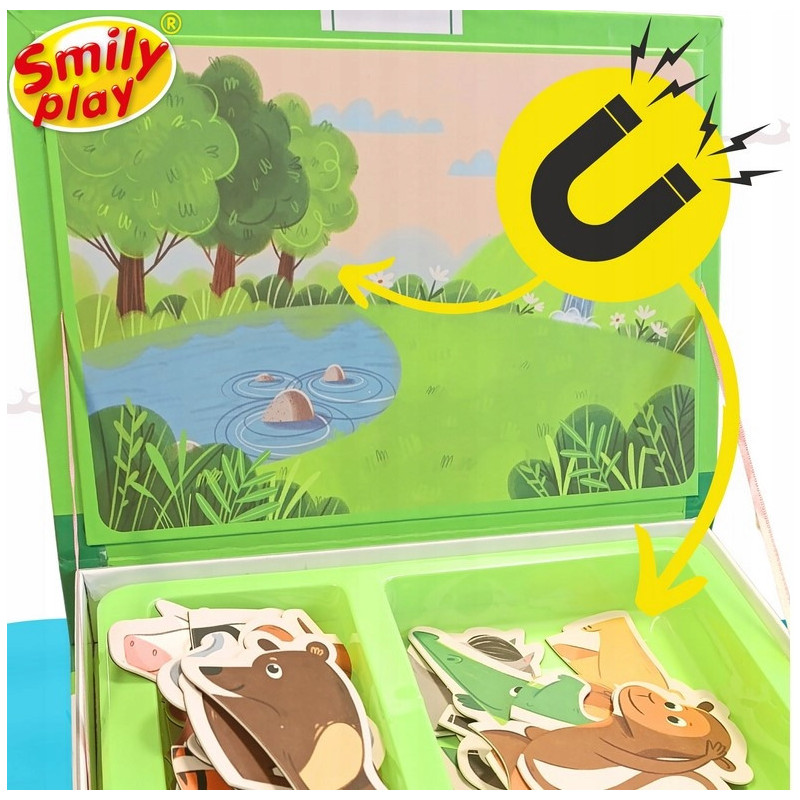 Książka magnetyczna polskiej marki Smily Play to zestaw 43 magnesów przedstawiających 16 zwierzątek z trzech zestawów: Farma, Zoo, Las. Dzięki nim można tworzyć własne, niepowtarzalne opowieści na tle pięknej polany z drzewami i urokliwym stawem. Każda historia ma innych bohaterów i przebieg, co daje dzieciom ogromne pole do wyobraźni i twórczej zabawy.