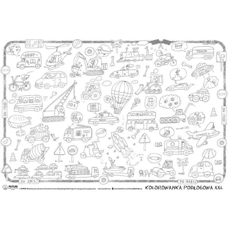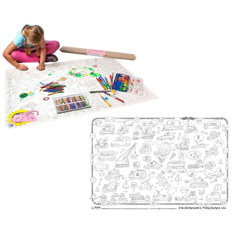 Kolorowanki Podłogowe w rozmiarze XXL o wymiarach 120cm x 80cm - ogromna powierzchnia do kolorowania kredkami, flamastrami i farbami. Wzmocniony spód arkusza zabezpiecza przed przesiąkaniem farb.