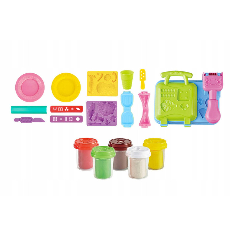 - W zestawie: kolorowa masa plastyczna oraz zestaw plastikowych akcesoriów do przygotowywania różnych "dań".