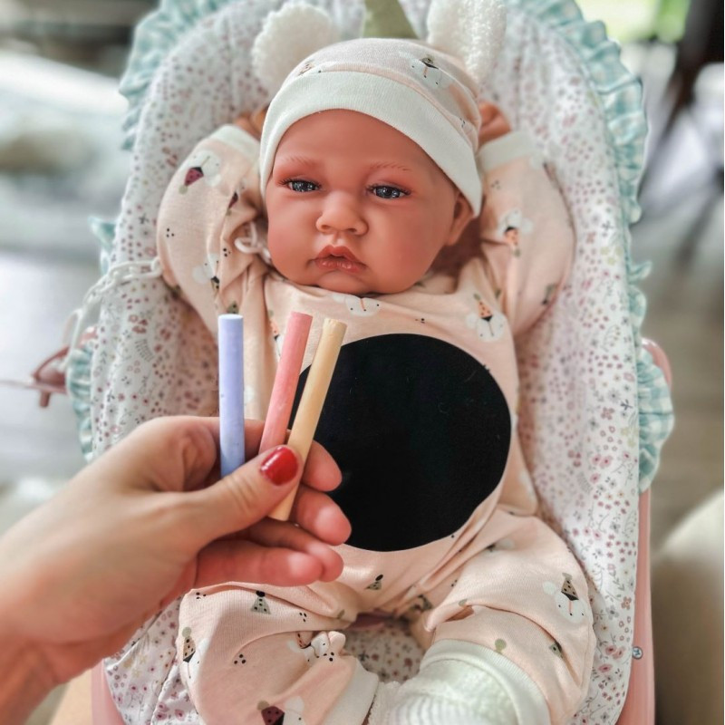 W zestawie z lalką Antonio Juan 33367 znajdują się: miękka piżama w delikatne wzory, słodka czapeczka, skarpetki, smoczek na łańcuszku, opakowanie kolorowej kredy.