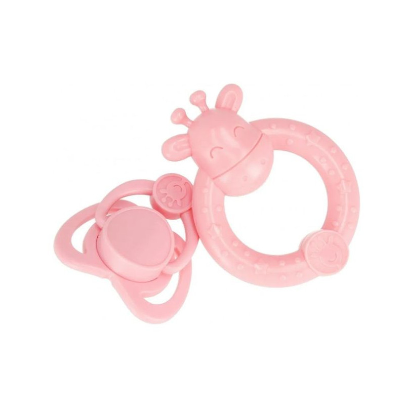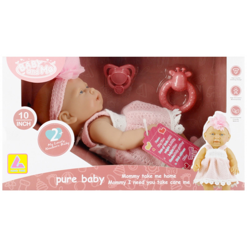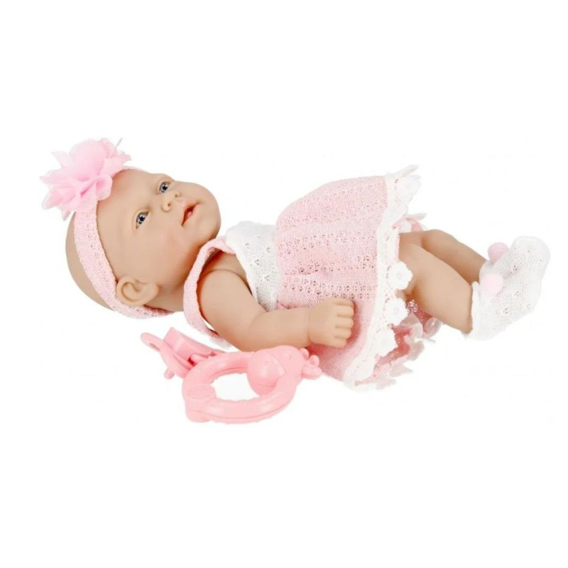 Zawartość zestawu lalka bobas 25 cm w ubranku, smoczek, grzechotka.