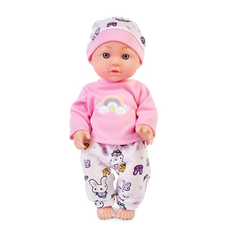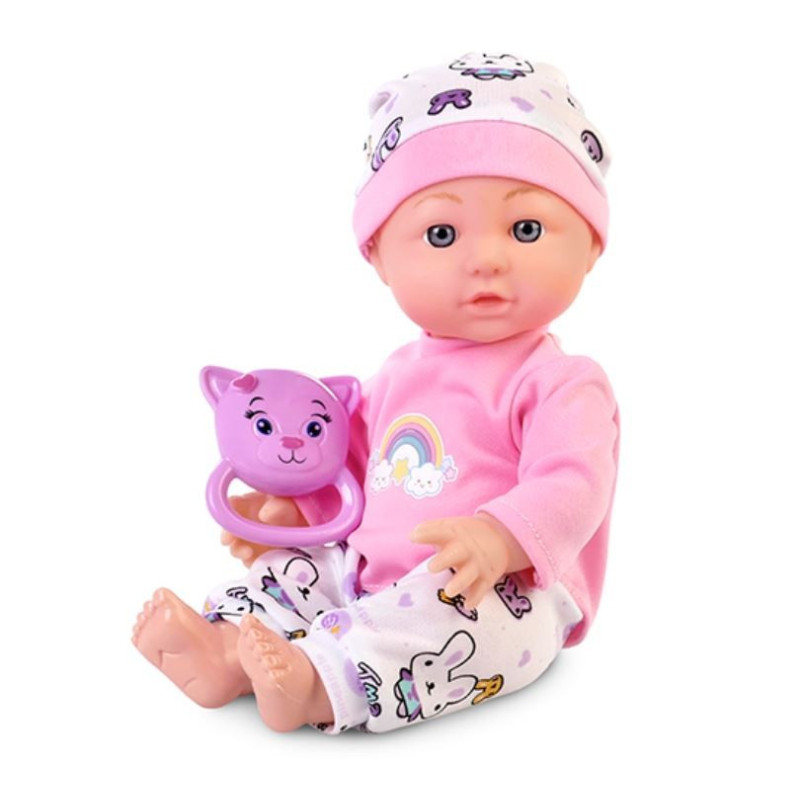 Funkcje: mówi: mama, tata, ma czkawkę, ziewa, przesyła buziaki, płacze, kaszle, gaworzy, kicha, śmieje się, odbija mu się, wydaje odgłos picia, Pozostałe informacje: wysokość lalki: 30 cm., wymiary opakowania 30 x 28 x 11 cm.,