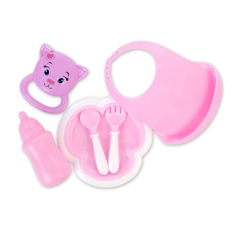W zestawie: lalka miękka, butelka, śliniak, miseczka, sztućce, grzechotka,