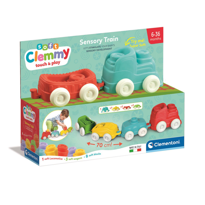 Pociąg sensoryczny Clemmy od Clementoni to bezpieczna i miękka zabawka stworzona specjalnie dla najmłodszych dzieci. Zestaw składa się z lokomotywy, wagoników oraz miękkich klocków, które można układać i łączyć.