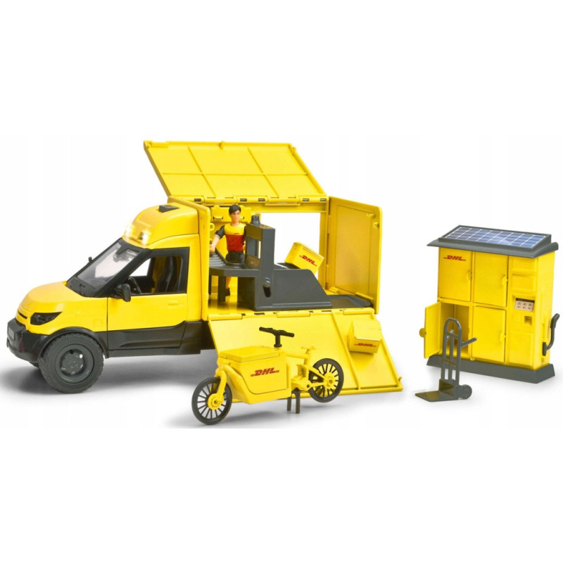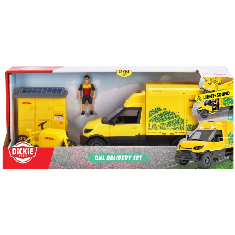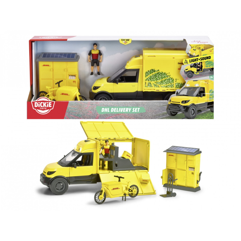 Zabawkowa furgonetka firmy DHL od Dickie Toys ma futurystyczny design z przyciągającą wzrok żółtą karoserią. Posiada ona otwierane boczne klapy, za którymi kryje się małe urządzenie do sortowania paczek. Jest również wyposażona w szereg realistycznych efektów świetlnych i dźwiękowych.