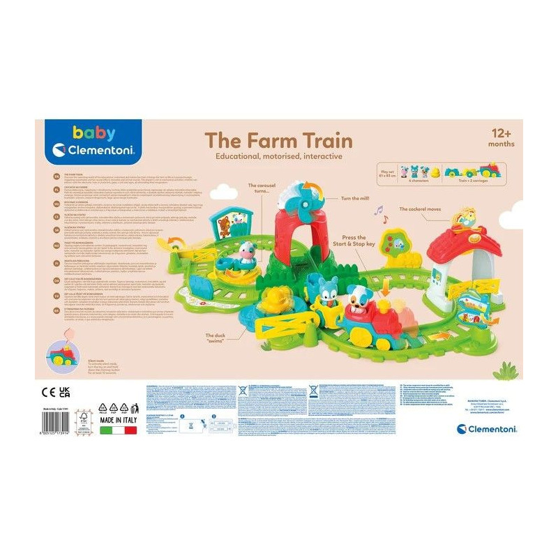 Napędzany ciuchcią pociąg zabiera Twoje dziecko w podróż po interaktywnej farmie. Podczas przejazdu pociąg wydaje zabawne dźwięki, melodie i odgłosy zwierząt, co sprawia, że zabawa staje się jeszcze bardziej fascynująca. Kręcąca się karuzelka, ruchomy wiatrak, pływająca kaczuszka i obracający się znak to tylko niektóre z elementów, które czekają na Twojego malucha.