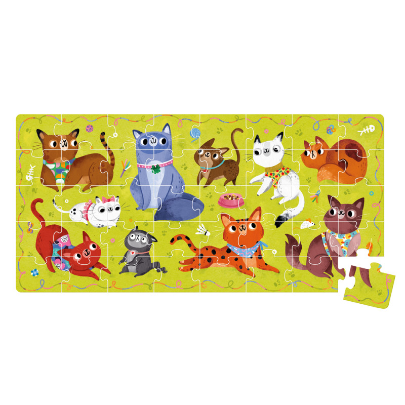 10 pięknych, dystyngowanych kotów i kociaków zaprasza do wesołej zabawy, która w pełen FRRRajdy sposób pozwoli doskonalić małą motorykę, spostrzegawczość i wyobraźnię. Duża układanka składa się z 40 elementów. To świetny pomysł na pierwsze skomplikowane puzzle dla układaczy w wieku przedszkolnym. Ułożone puzzle to piękna dekoracja pokoju młodych miłośników miauczących domowników!