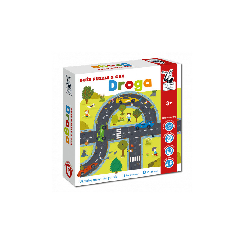Duże puzzle z grą „Droga” (3+) to prawie trzymetrowa układanka, z którą można zbudować mnóstwo dróg o różnych kształtach i wykorzystać do wyścigu samochodami. Wystarczy puścić wodze fantazji i stworzyć nawet najbardziej odjechane trasy. Kto wie, co może się wydarzyć na drodze!? Miłośników szybkiej jazdy czekają natomiast niesamowite przygody – mogą sprawdzić swoje możliwości w grze rozwijającej myślenie strategiczne. Dzięki układaniu drogi dzieci rozwijają wyobraźnię przestrzenną i kreatywność, a podczas gry doskonalą również kompetencje społeczne.