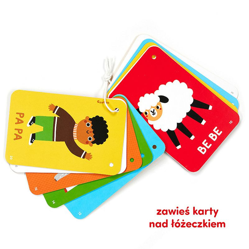 Poręczna kontrastowa książeczka ma formę 10 kart spiętych sznureczkiem.