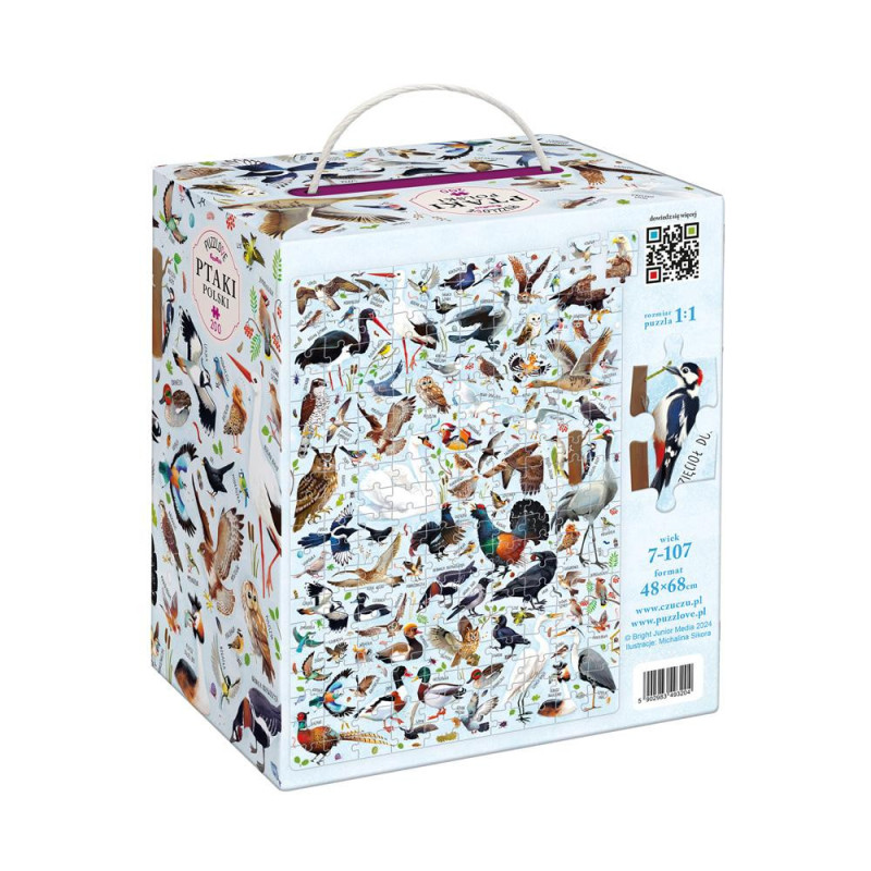 Duża 200-elementowa układanka przedstawia przeróżne gatunki ptaków, które można spotkać w Polsce, czasem na co dzień,