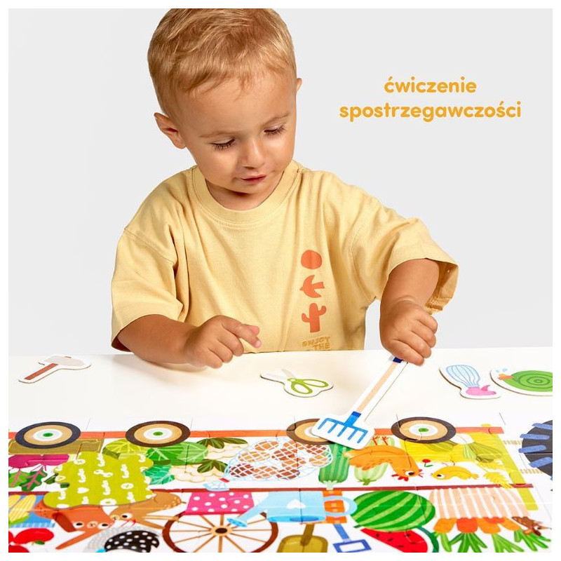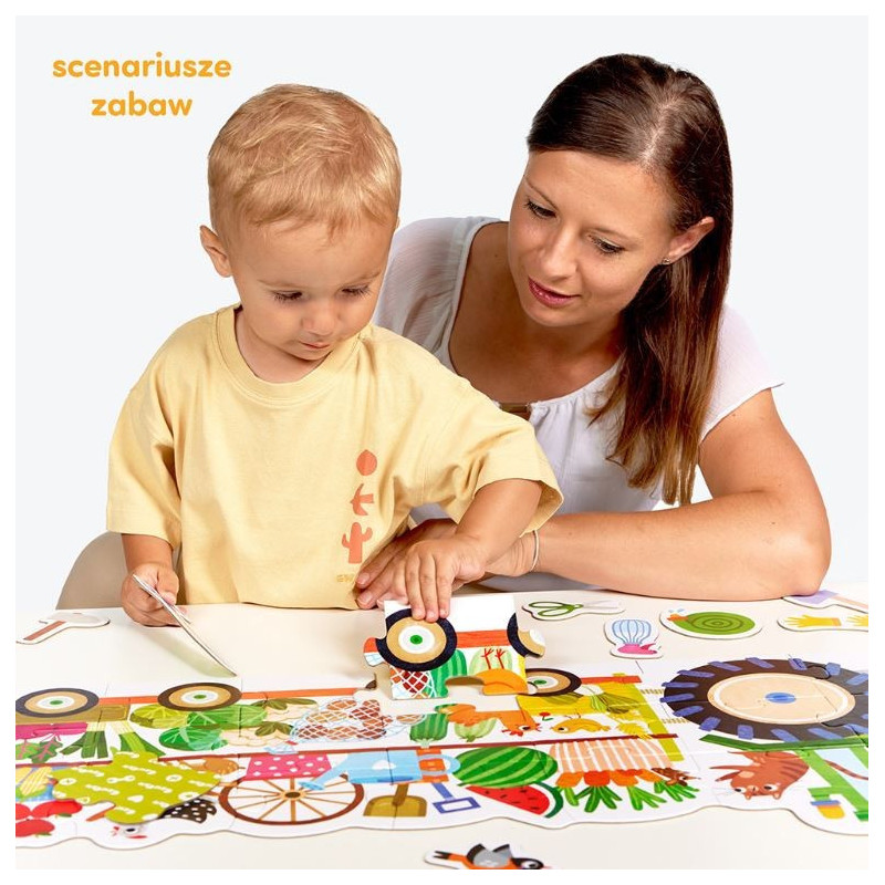 Zestaw zawiera: 24 puzzle, 12 dokładanych obrazków, scenariusze zabaw