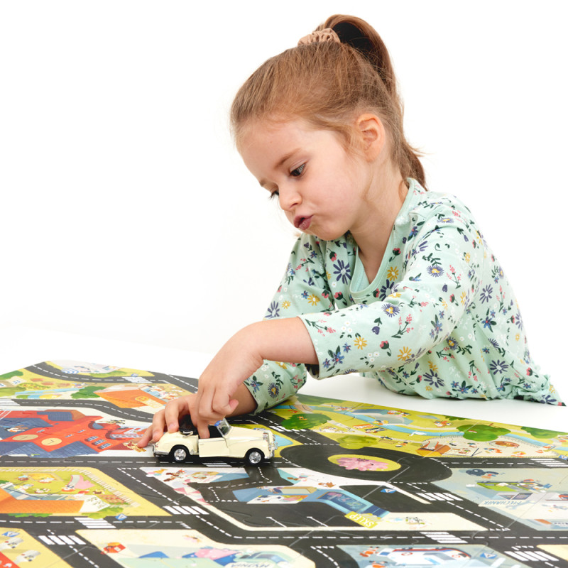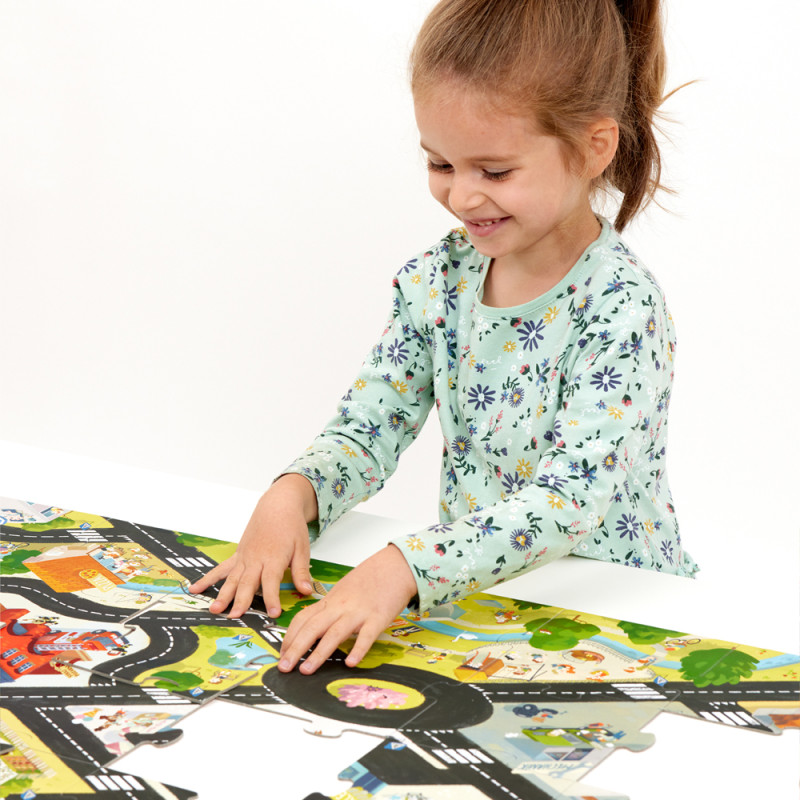 Ogromne puzzle podłogowe od CzuCzu pozwalają stworzyć na podłodze prawdziwy plan miasteczka. Ułożony obrazek przedstawia kręte ulice i rozmaite budynki, które można spotkać w mieście: domy, szkołę, szpital, komisariat, sklep, myjnię samochodową, plac budowy, punkt mechanika, pizzerię, kwaterę strażacką czy stację benzynową. Puzzle z wyjątkowo ciekawą i pełną kolorów ilustracją, spodobają się każdemu dziecku, które lubi bawić się autkami.