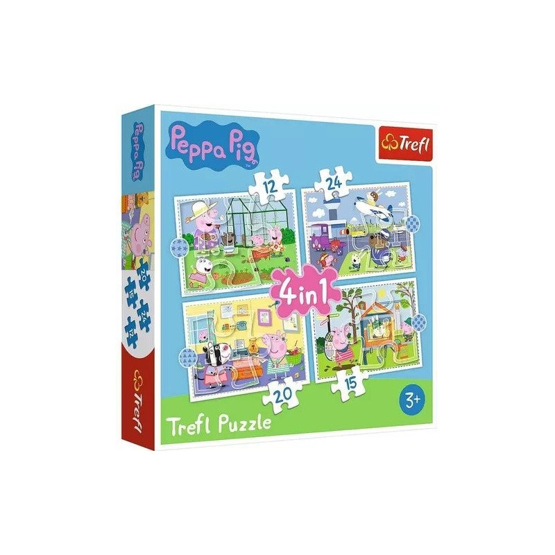 Puzzle 4 w 1 składające się z 4 niezależnych układanek, zaprojektowane z myślą o wszystkich fanach i fankach bajki Świnka Peppa